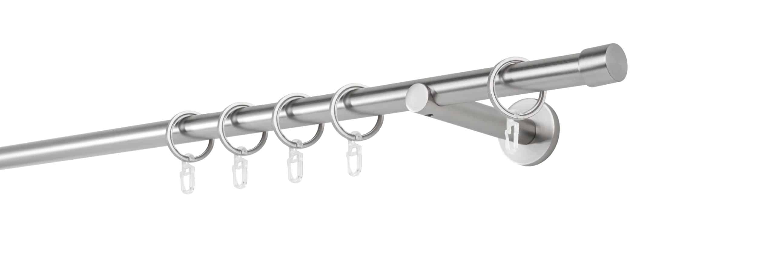 Verleihen Sie Ihren Vorhängen und Gardinen einen Hauch von zeitloser Eleganz mit unserem hochwertigen 20mm, 1-läufigen Rohr-Wandträger-Set. Dieses Komplettset, bestehend aus einem robusten Rohr, stabilen Wandträgern und formschönen Endstücken, bietet Ihnen alles, was Sie für eine stilvolle Fensterdekoration benötigen. Mit einer Länge von 300cm und einer edlen Edelstahl-Optik wird dieses Set zum Blickfang in jedem Raum.