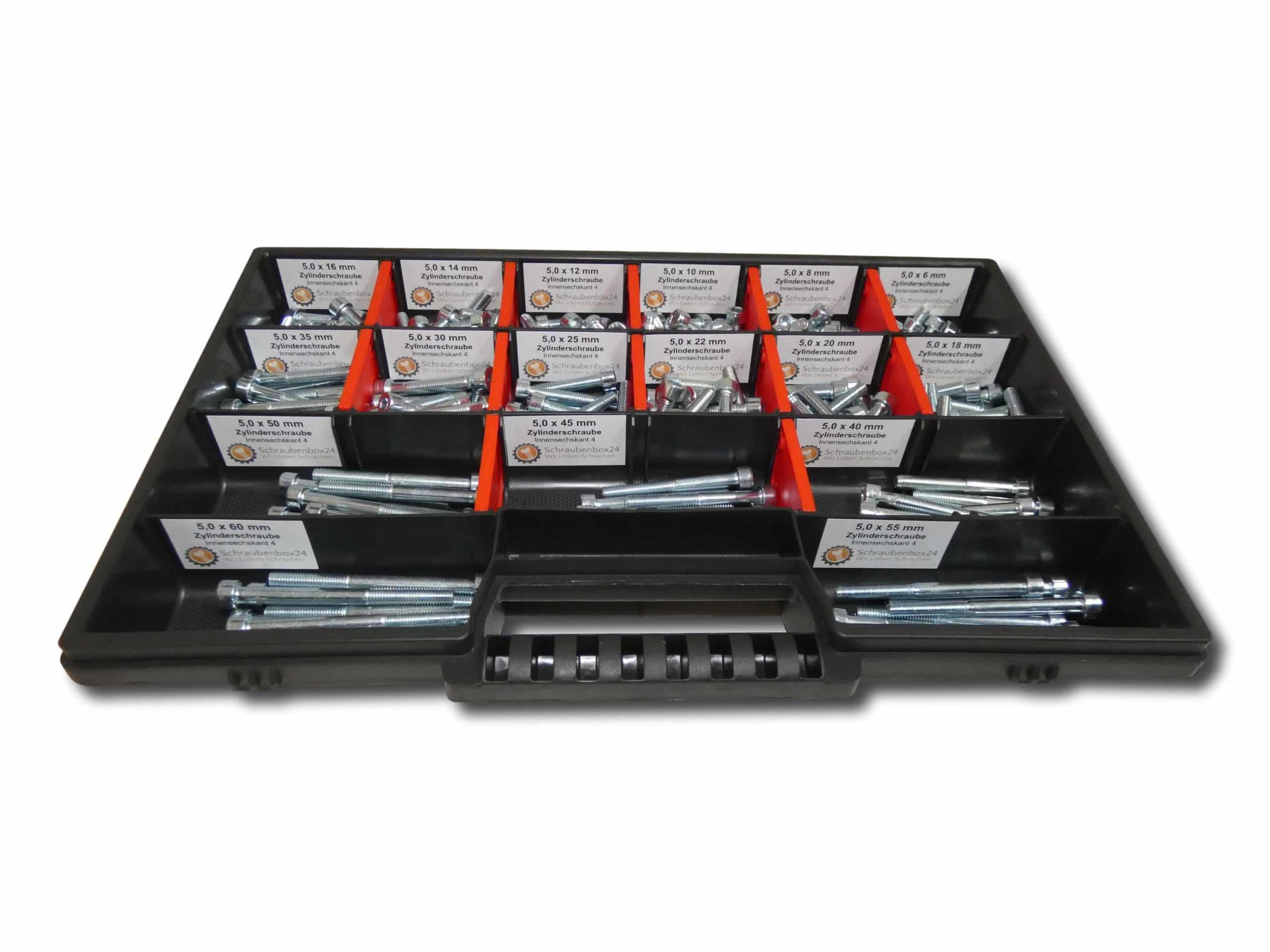 Die Schraubenbox ist ein unverzichtbarer Bestandteil unseres 300-teiligen Zylinderschrauben-Sortiments M5 und sorgt dafür, dass Sie Ihr Schrauben-Sortiment immer ordentlich, übersichtlich und griffbereit haben.