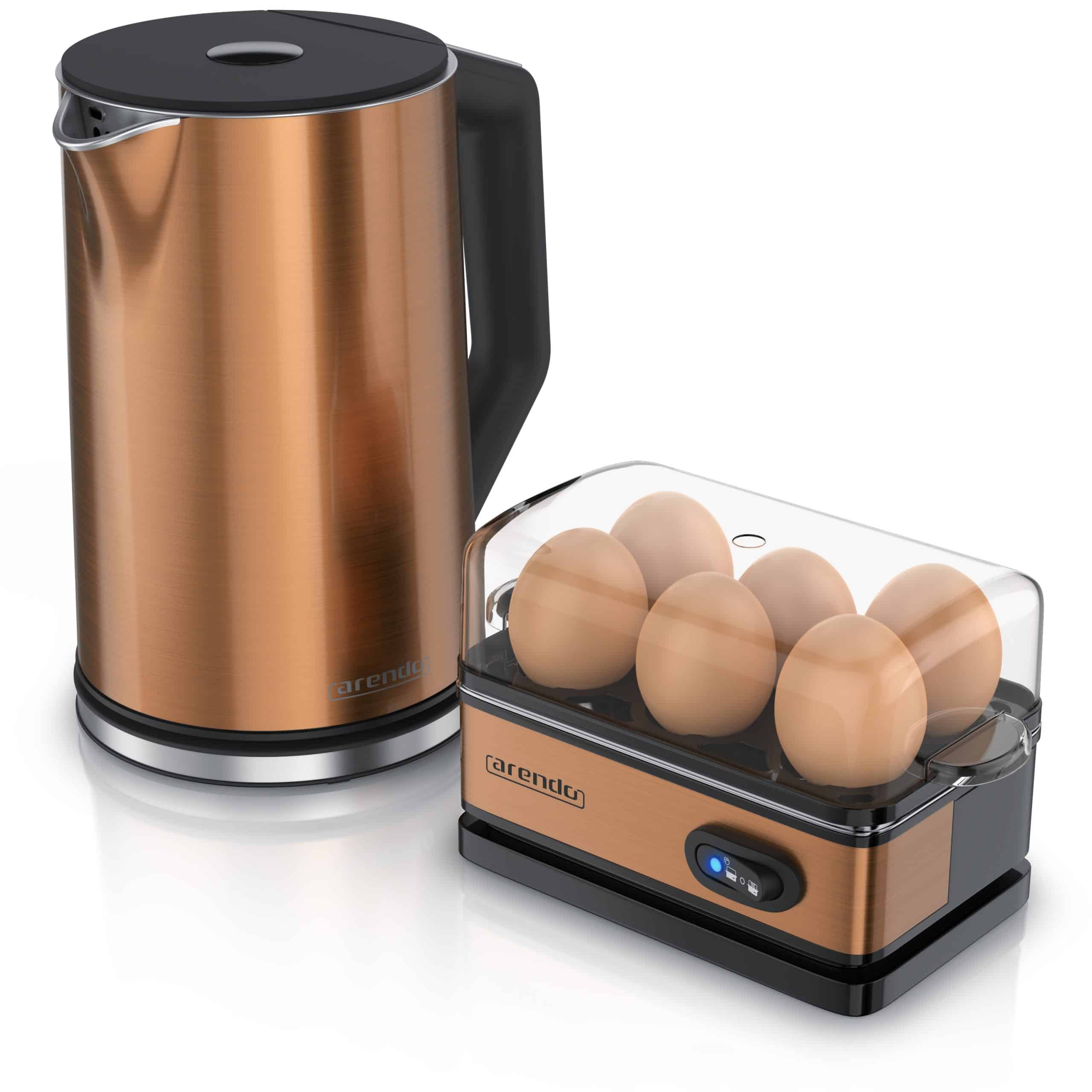 Das Arendo Frühstücksset ist mehr als nur eine Kombination aus Wasserkocher und Eierkocher. Es ist ein Statement für guten Geschmack und ein Beweis dafür, dass Funktionalität und Ästhetik Hand in Hand gehen können. Die elegante Kupferfarbe verleiht Ihrer Küche einen Hauch von Luxus und sorgt für einen stilvollen Blickfang. Aber nicht nur das Aussehen überzeugt – auch die inneren Werte des Sets lassen keine Wünsche offen.