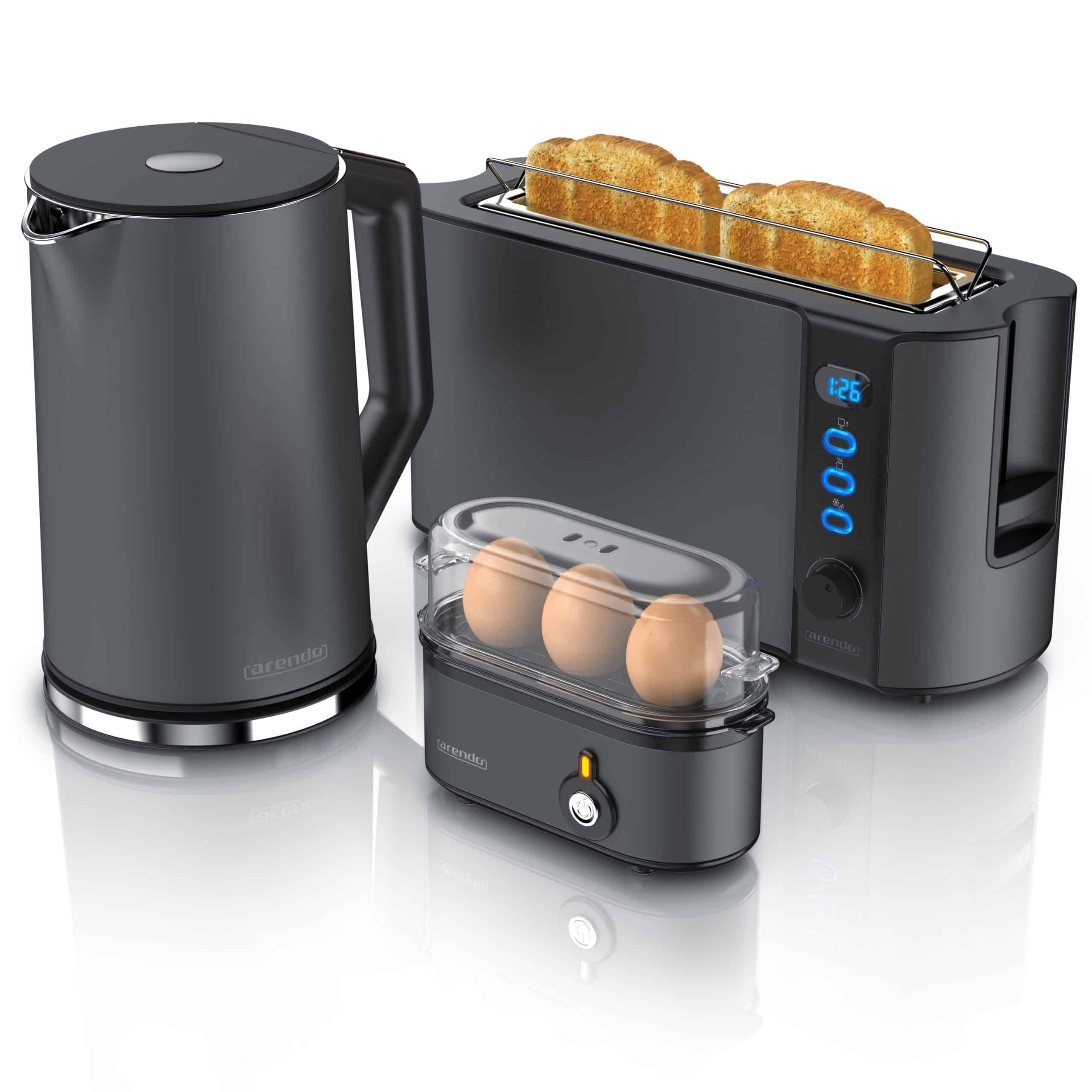 Das Arendo Frühstücks-Set besteht aus drei hochwertigen Geräten: einem Wasserkocher, einem Toaster und einem Eierkocher. Alle Geräte sind in einem edlen Grauton gehalten, der sich nahtlos in jede Kücheneinrichtung einfügt. Entdecke, wie dieses Set deinen Morgen verzaubern kann!