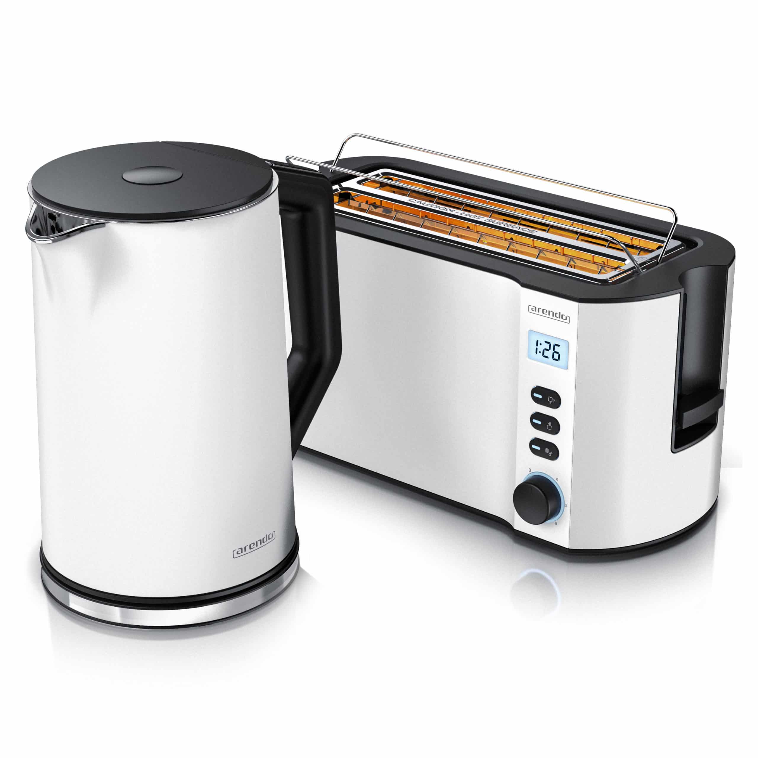 Das Arendo Frühstücks-Set, bestehend aus einem 1,5L Wasserkocher mit Temperatureinstellung und einem 4-Scheiben Langschlitztoaster, ist die ideale Ergänzung für jeden Haushalt. Das schlichte, moderne Design in strahlendem Weiß fügt sich nahtlos in jede Kücheneinrichtung ein und verleiht Ihrem Frühstückstisch einen Hauch von Eleganz. Doch das Set überzeugt nicht nur optisch, sondern auch durch seine hohe Funktionalität und einfache Bedienung.
