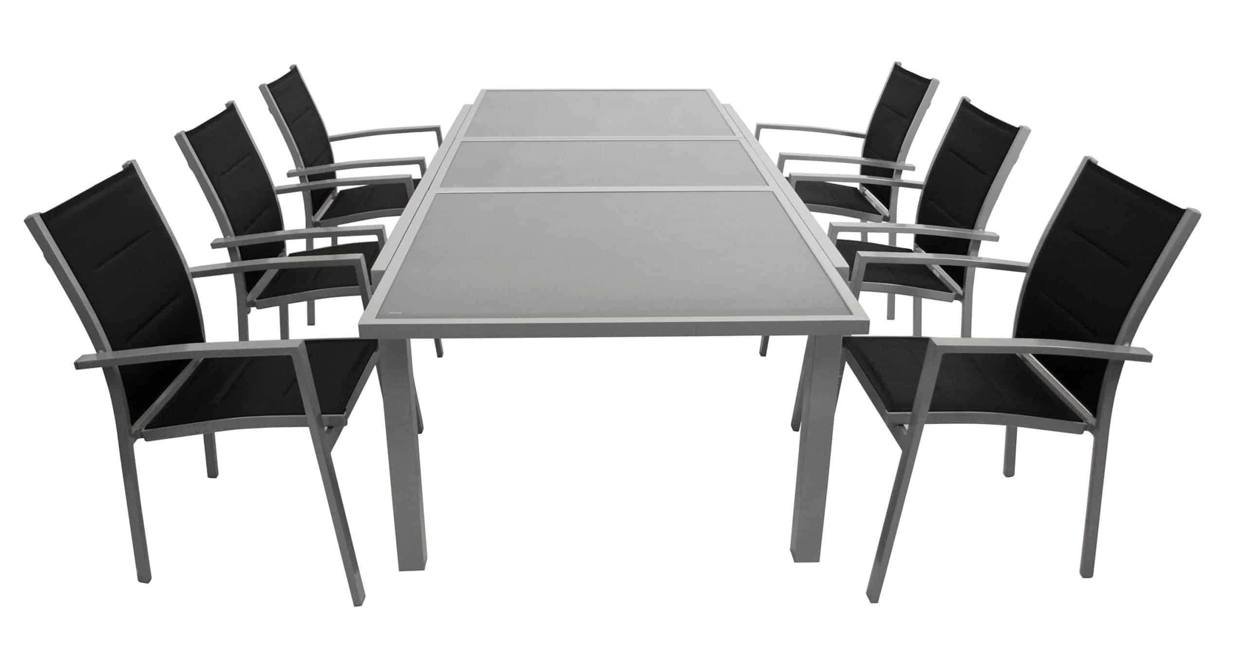 Verwandeln Sie Ihre Terrasse in eine stilvolle Wohlfühloase mit der eleganten DEGAMO Garnitur PISA. Dieses 7-teilige Set vereint modernes Design mit höchstem Komfort und verspricht entspannte Stunden im Freien – ob mit Familie, Freunden oder einfach nur für sich allein. Die Kombination aus hochwertigem Aluminium in edlem Silbergrau, eleganten Glasplatten und dem strapazierfähigen Kunstgewebe in Schwarz macht die Garnitur zu einem echten Blickfang in jedem Garten.