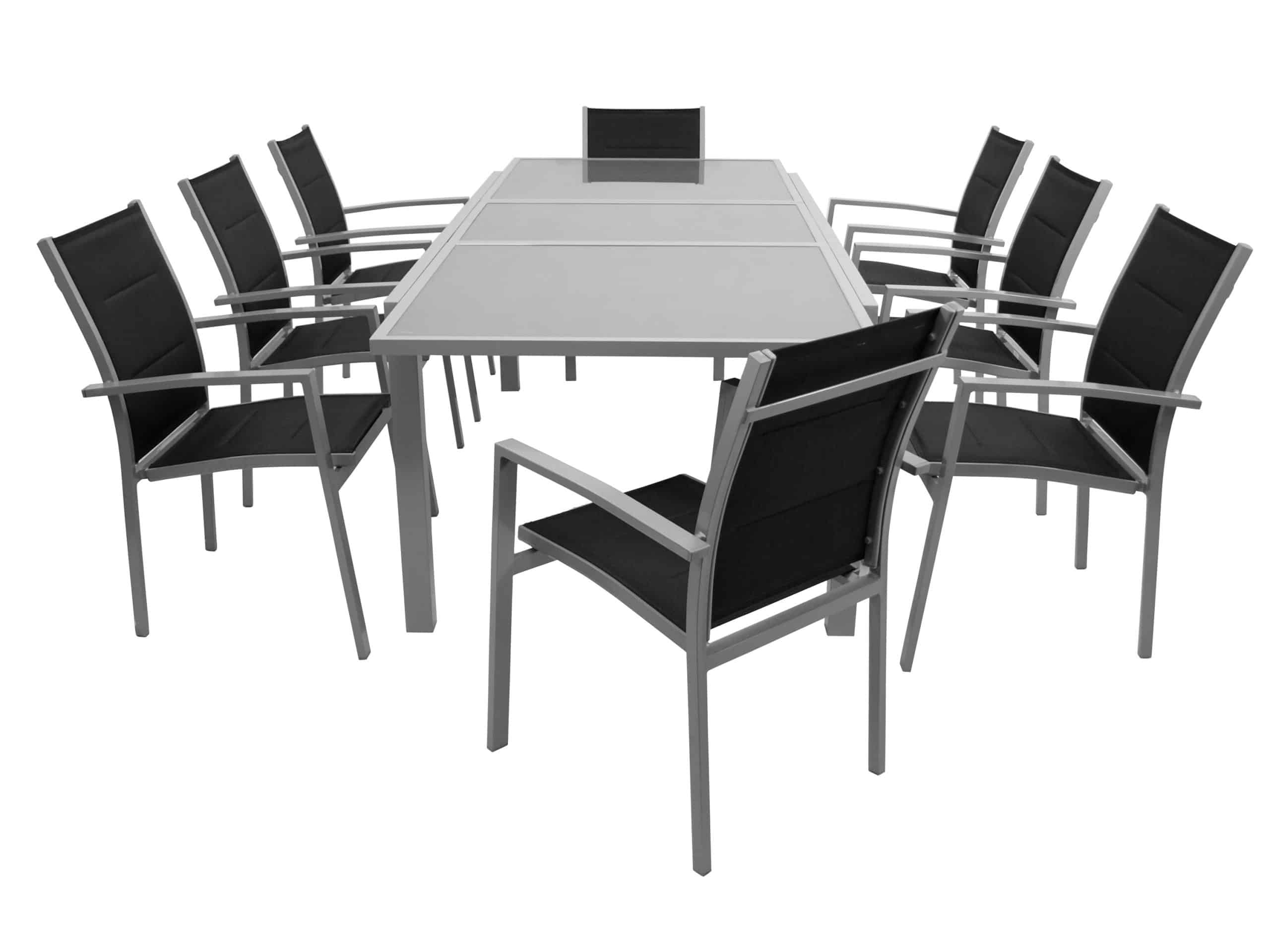 Erleben Sie mit der DEGAMO Garnitur PISA ein neues Niveau an Komfort und Eleganz in Ihrem Außenbereich. Dieses 9-teilige Gartenmöbelset vereint modernes Design mit hochwertigen Materialien und bietet Ihnen und Ihren Gästen eine stilvolle und einladende Atmosphäre für entspannte Stunden im Freien. Die Kombination aus silbergrauem Aluminium, edlem Glas und strapazierfähigem, schwarzem Kunstgewebe macht die PISA Garnitur zu einem echten Hingucker auf Ihrer Terrasse oder Ihrem Balkon.