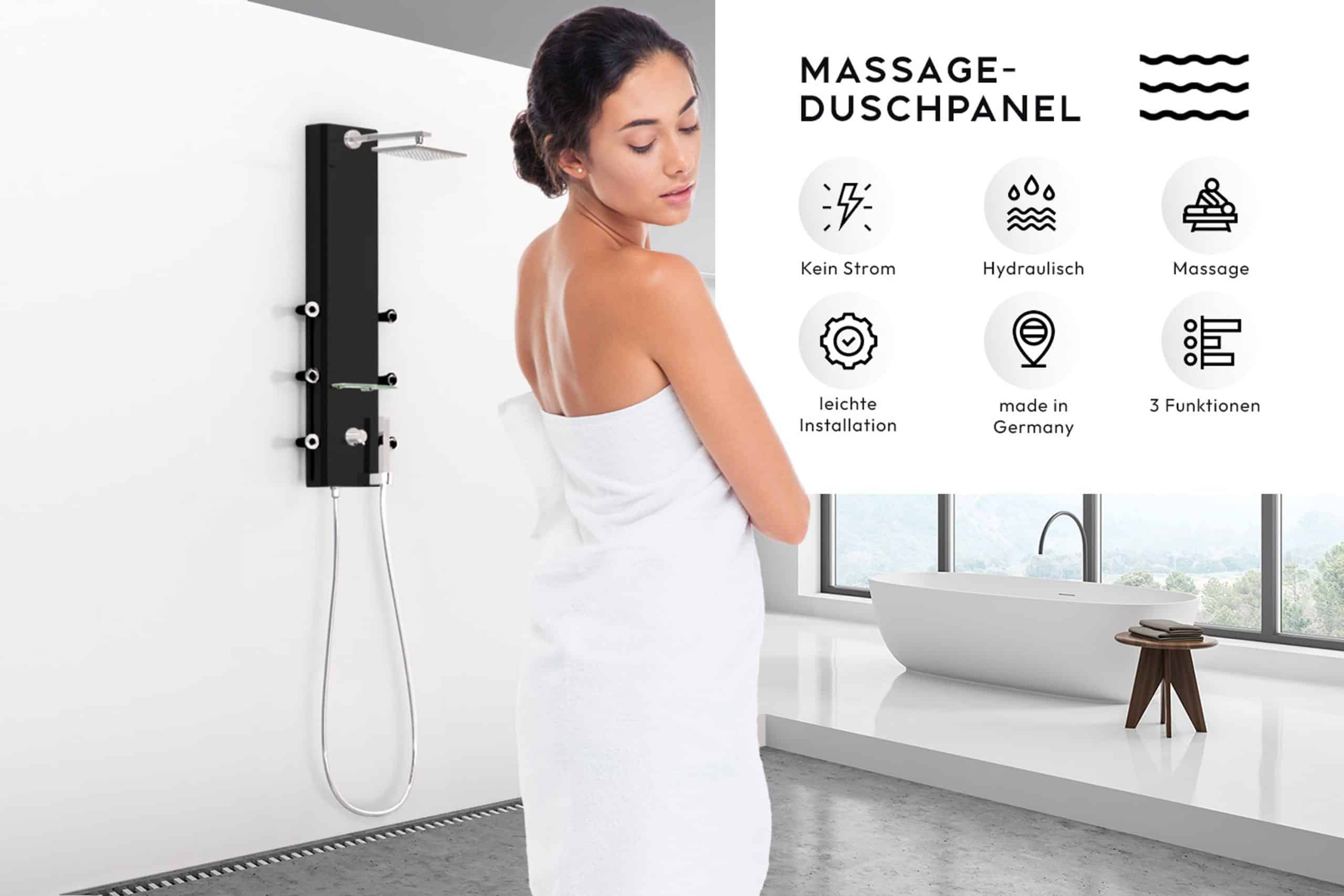 Gönnen Sie sich das Besondere und erleben Sie Duschkomfort neu definiert mit dem Dusbad Aqua Dancer – dem einzigartigen beweglichen Duschpaneel Made in Germany in elegantem Schwarz.