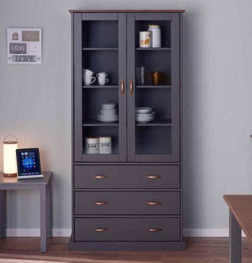 Das Design der Inter Link FSC Vitrine Westerland ist geprägt von klaren Linien, schlichter Eleganz und skandinavischer Funktionalität. Die graue Oberfläche in Kombination mit dem natürlichen Holzton verleiht der Vitrine eine moderne und zugleich warme Ausstrahlung. Die Glastüren ermöglichen es Ihnen, Ihre schönsten Dekorationen, Ihr edles Geschirr oder Ihre wertvollen Sammlerstücke stilvoll zu präsentieren.