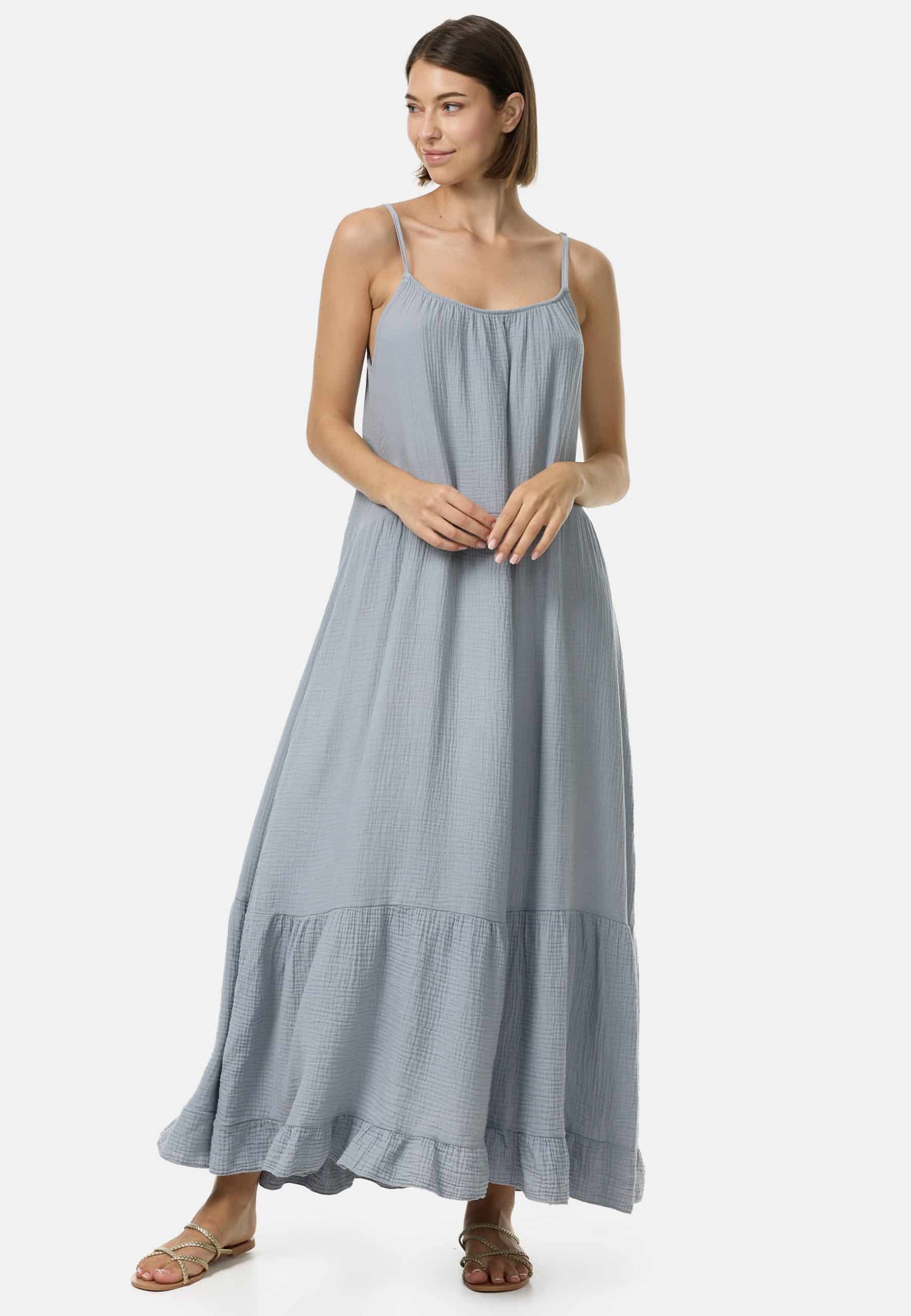 Das Kleid besteht aus hochwertigem und atmungsaktivem Musselin.