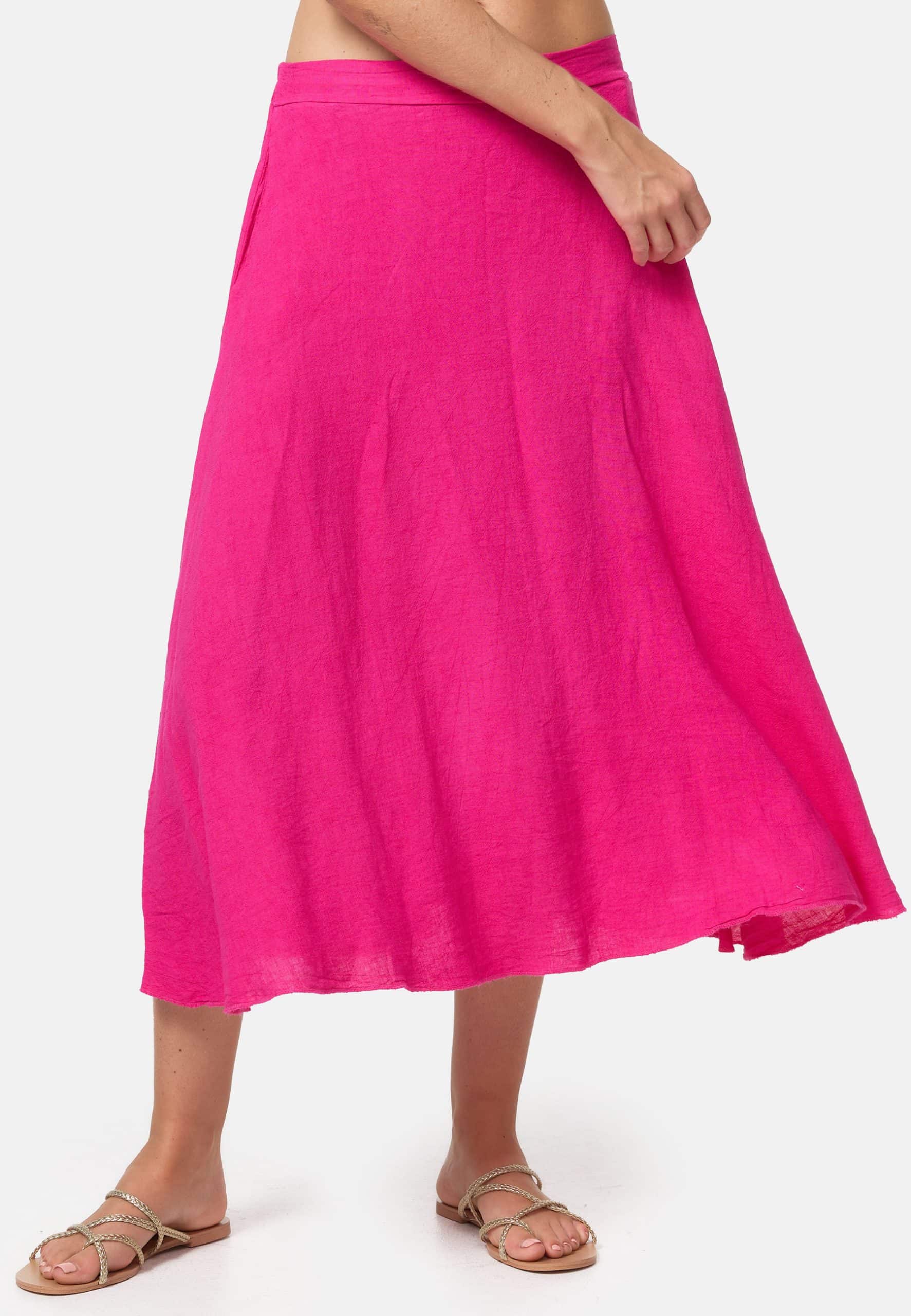 Der Rock besteht aus hochwertigem Leinen. Dieses Naturmaterial ist atmungsaktiv, hautfreundlich und besonders angenehm zu tragen, gerade im Sommer.