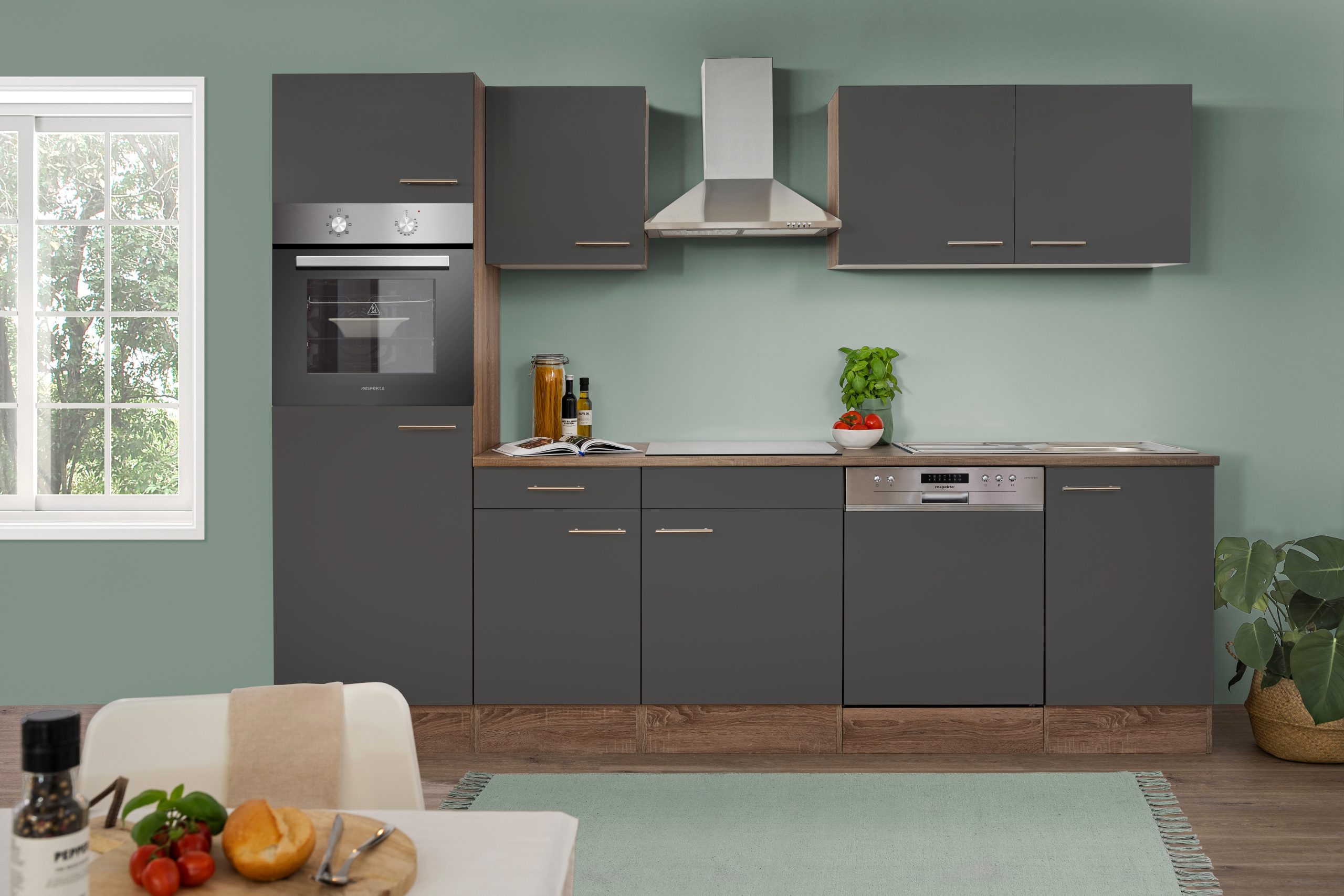 Entdecken Sie mit der Respekta Küchenzeile Eiche York den perfekten Start in Ihr neues Küchenabenteuer! Diese stilvolle und funktionale Küchenzeile in der angesagten Farbkombination Eiche York und Grau verwandelt Ihren Kochbereich in einen Ort, an dem Kochen zum Vergnügen wird. Mit einer Breite von 280 cm bietet sie ausreichend Stauraum und Arbeitsfläche, um Ihre kulinarischen Träume zu verwirklichen. Die inkludierten Elektrogeräte und die hochwertige Mineralite Einbauspüle machen diese Küchenzeile zu einem echten Komplettpaket.