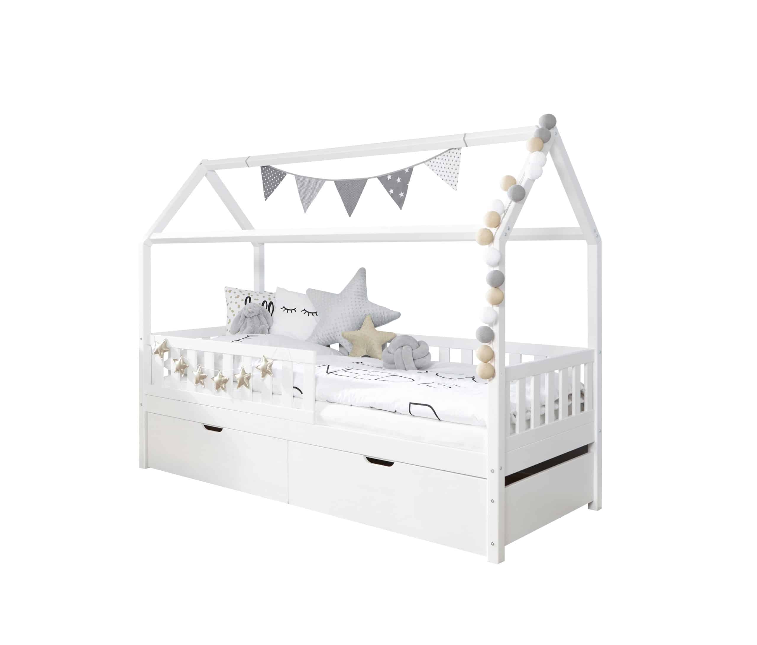 | Lieferumfang | Hausbett, 2 Schubkästen, Lattenrost, Montagematerial, Aufbauanleitung (ohne Matratze und Dekoration) |