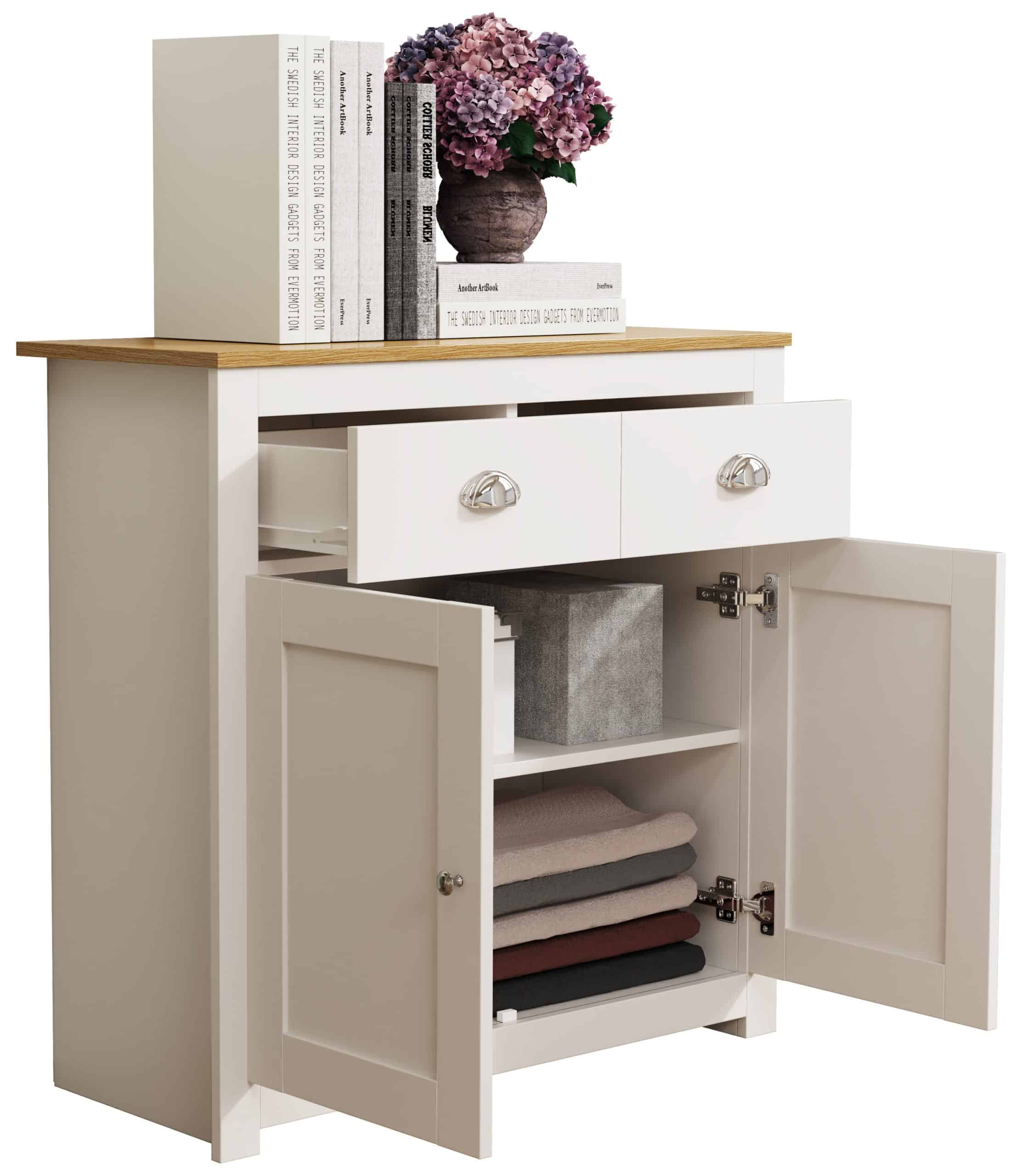 - Vielseitiger Stauraum: Drehtüren und Schubladen bieten ausreichend Platz für unterschiedlichste Gegenstände.
